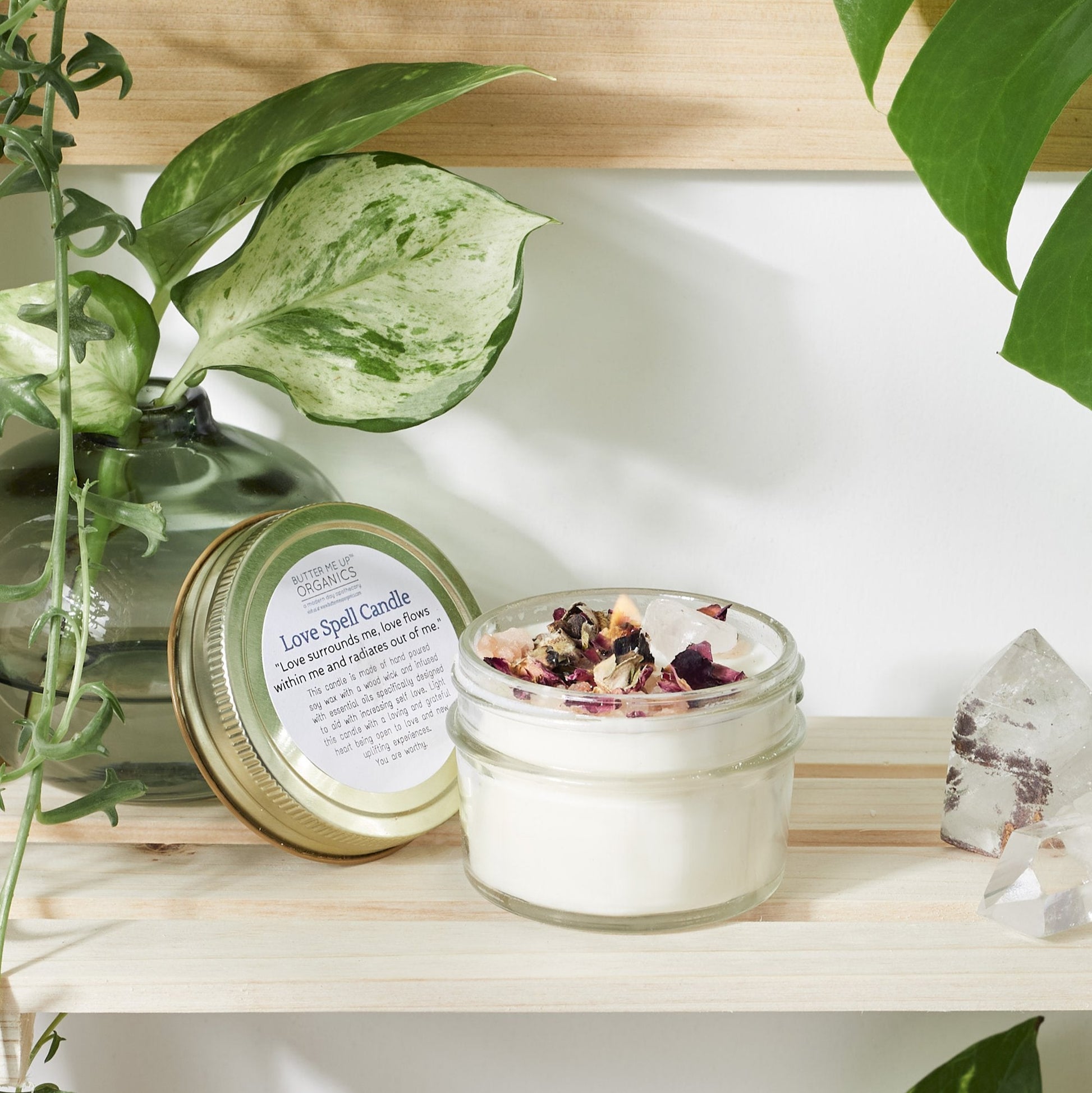 This beautiful candle is infused with organic essential oils and topped with elements chosen to evoke a feeling of warmth and affection. The red roses symbolize love, the pink salt helps to purify your space, and the rose quartz crystal—a true symbol of love—adds a touch of serenity. Light this candle as a reminder to focus on the love and light that surrounds you and to take a moment for yourself.